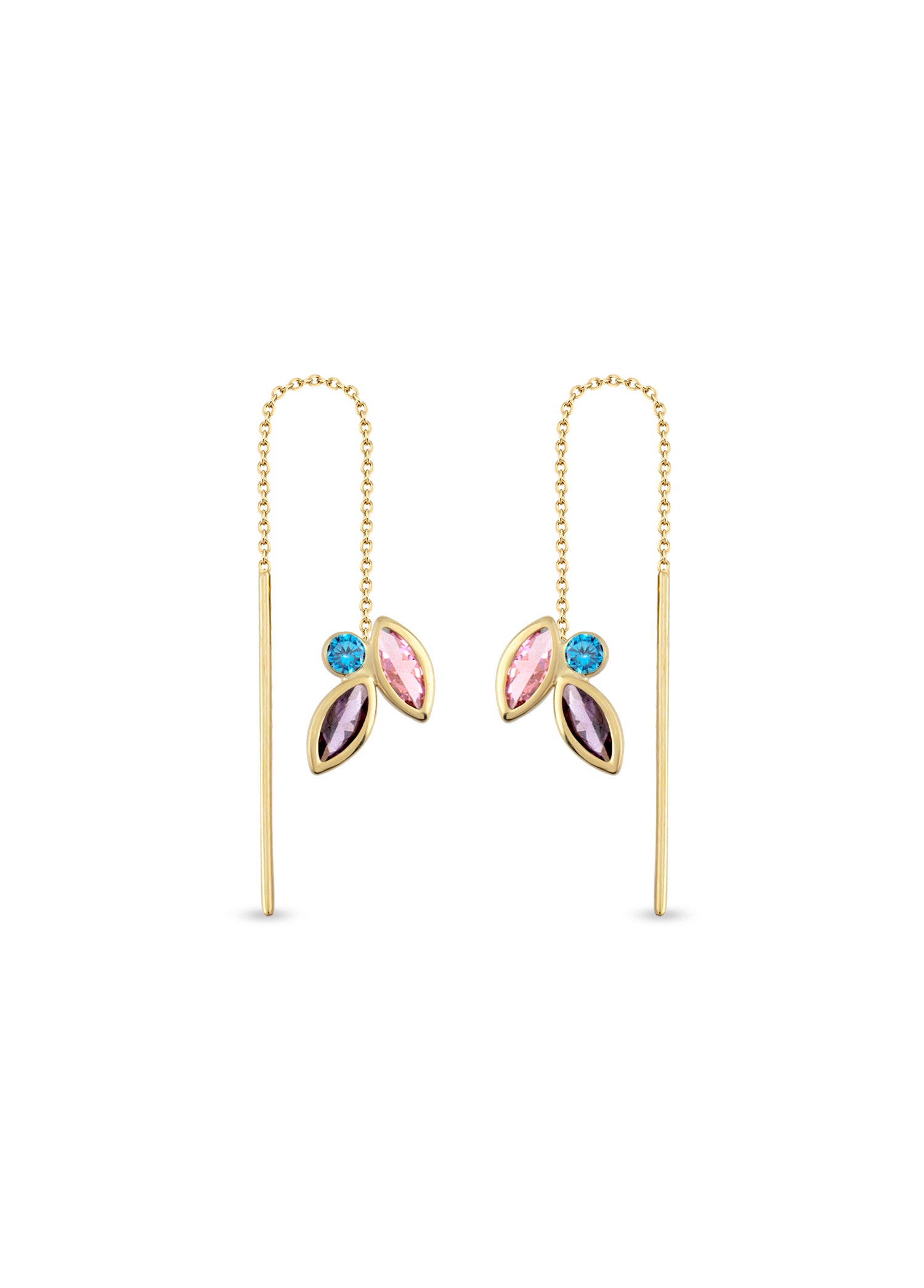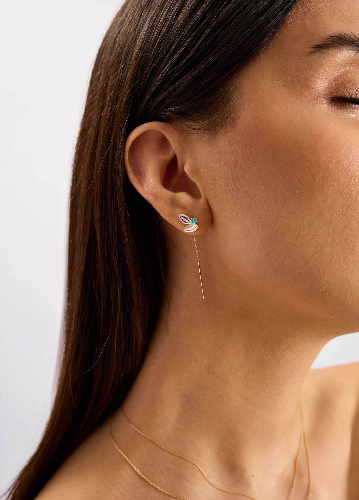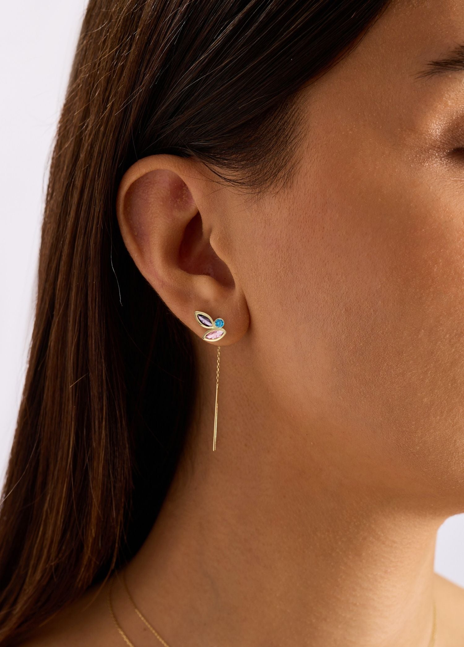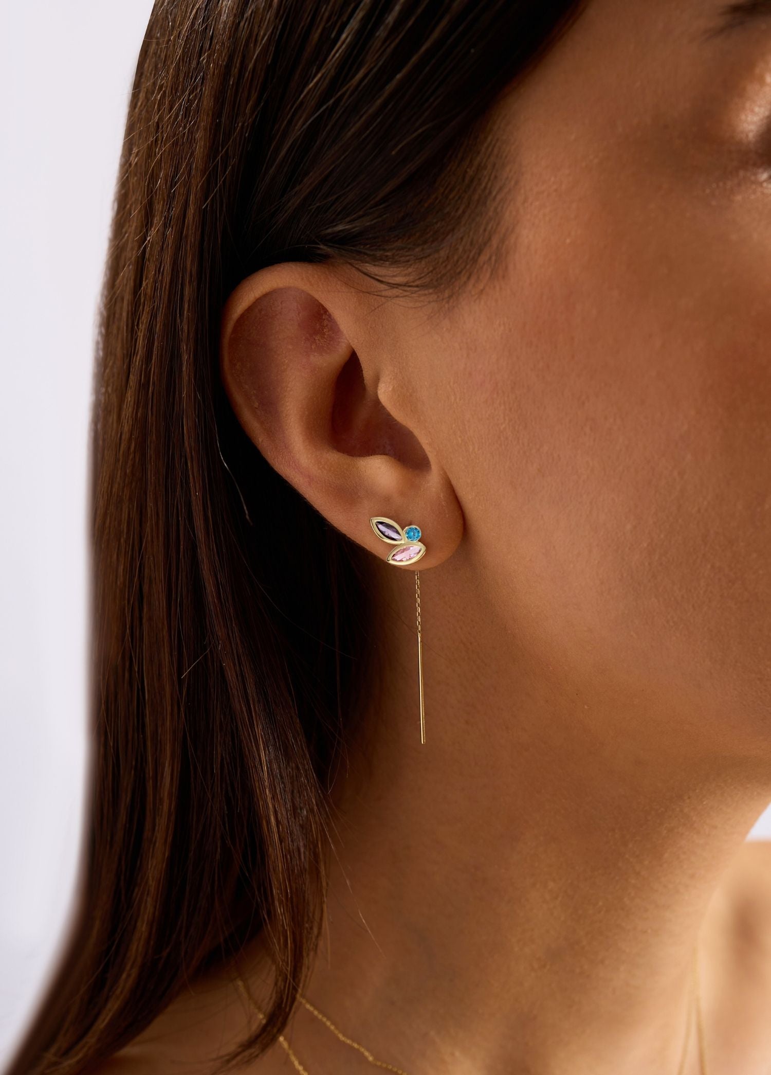Fleur 14 Ayar Altın Kadın Küpe; çiçeklerin zarafetini, renklerin uyumunu ve feminen inceliği yansıtan özel bir tasarımdır. İki markiz taşın zarif yaprak formu, doğanın asaleti ve akışkan güzelliğini simgelerken, merkezdeki yuvarlak kesim safir taşı derin bir huzur, bilgelik ve sakin enerji hissi uyandırır.