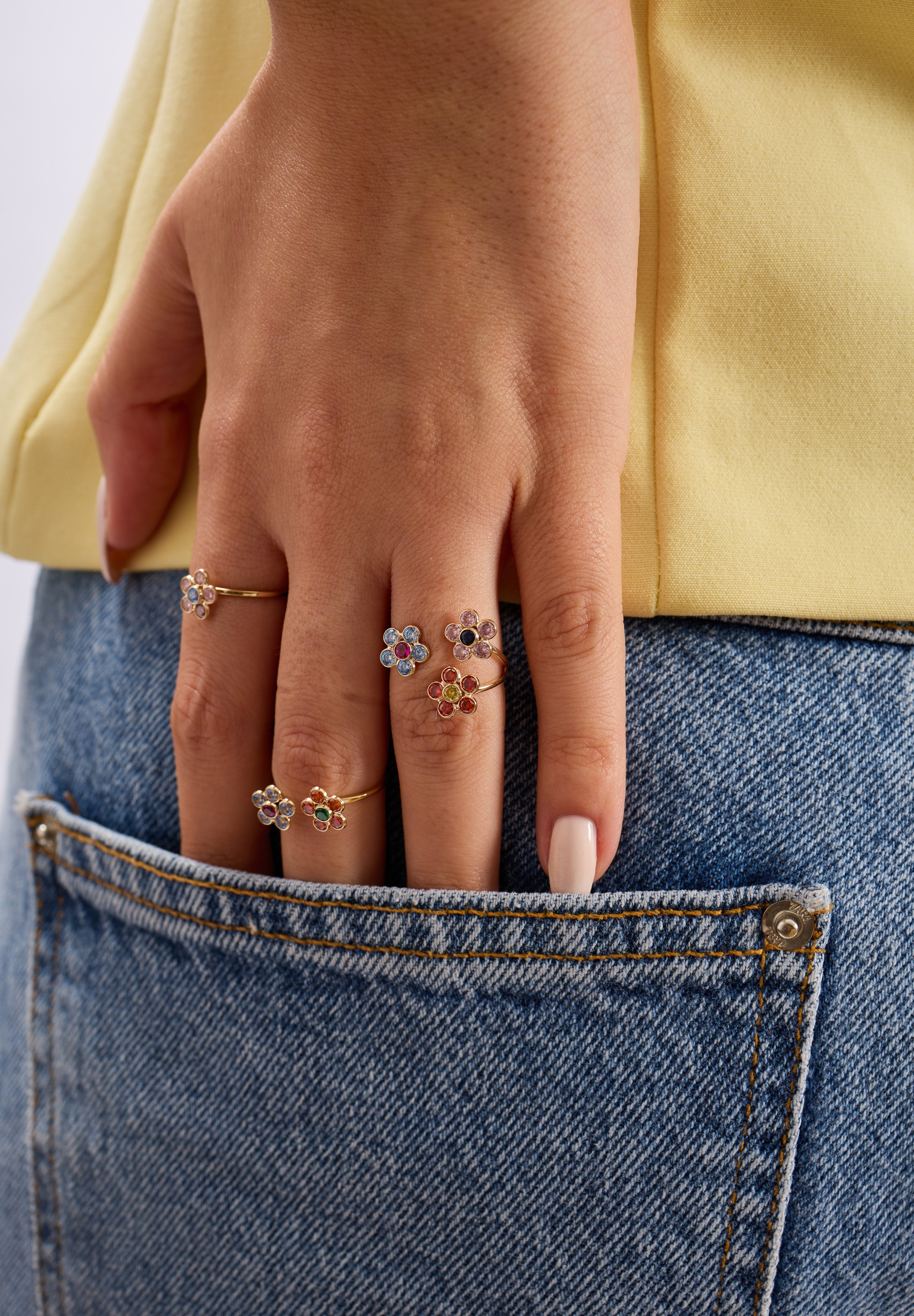 Pink Daisy 14 Ayar Altın Kadın Yüzük; zarafetin, sevginin ve neşeli bir enerjinin simgesi olarak tasarlanmıştır. Papatyanın saf formu, pembe taşların romantik ışıltısıyla birleşerek feminen bir zarafet ve pozitif bir ruh hali yaratır. Bu özel tasarım, doğanın tazeliğini ve duygusal sıcaklığı modern bir mücevher estetiğinde buluşturur.