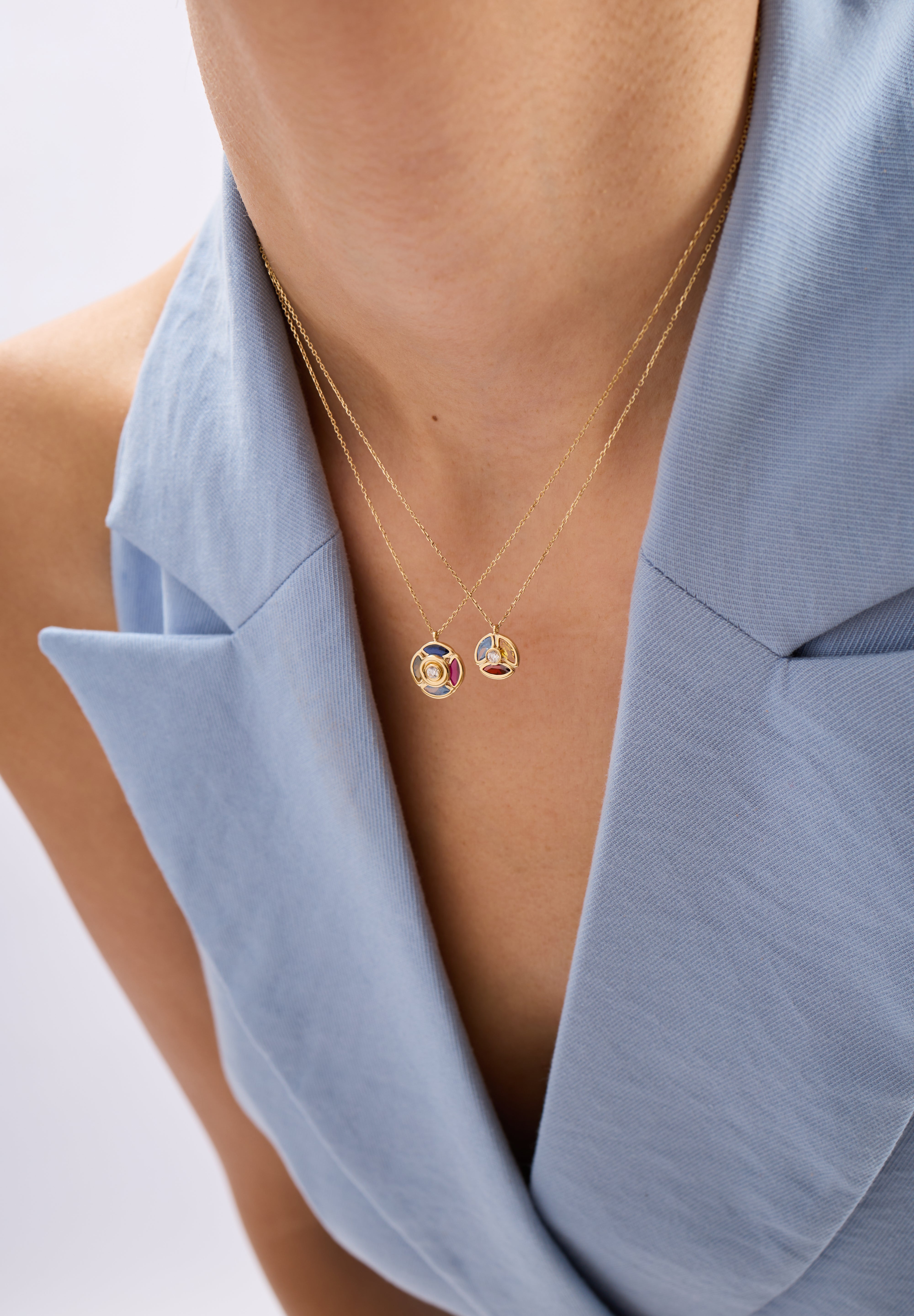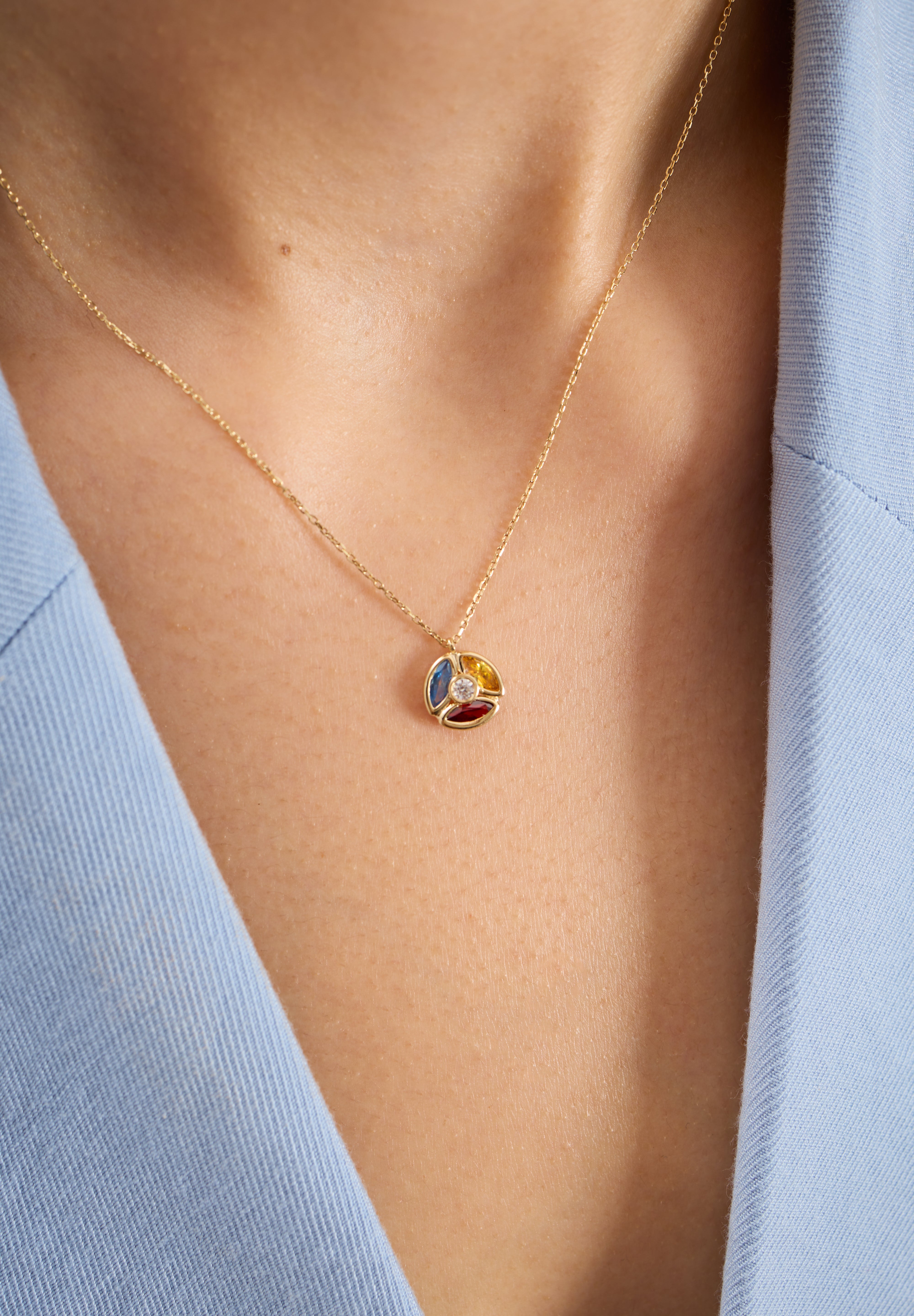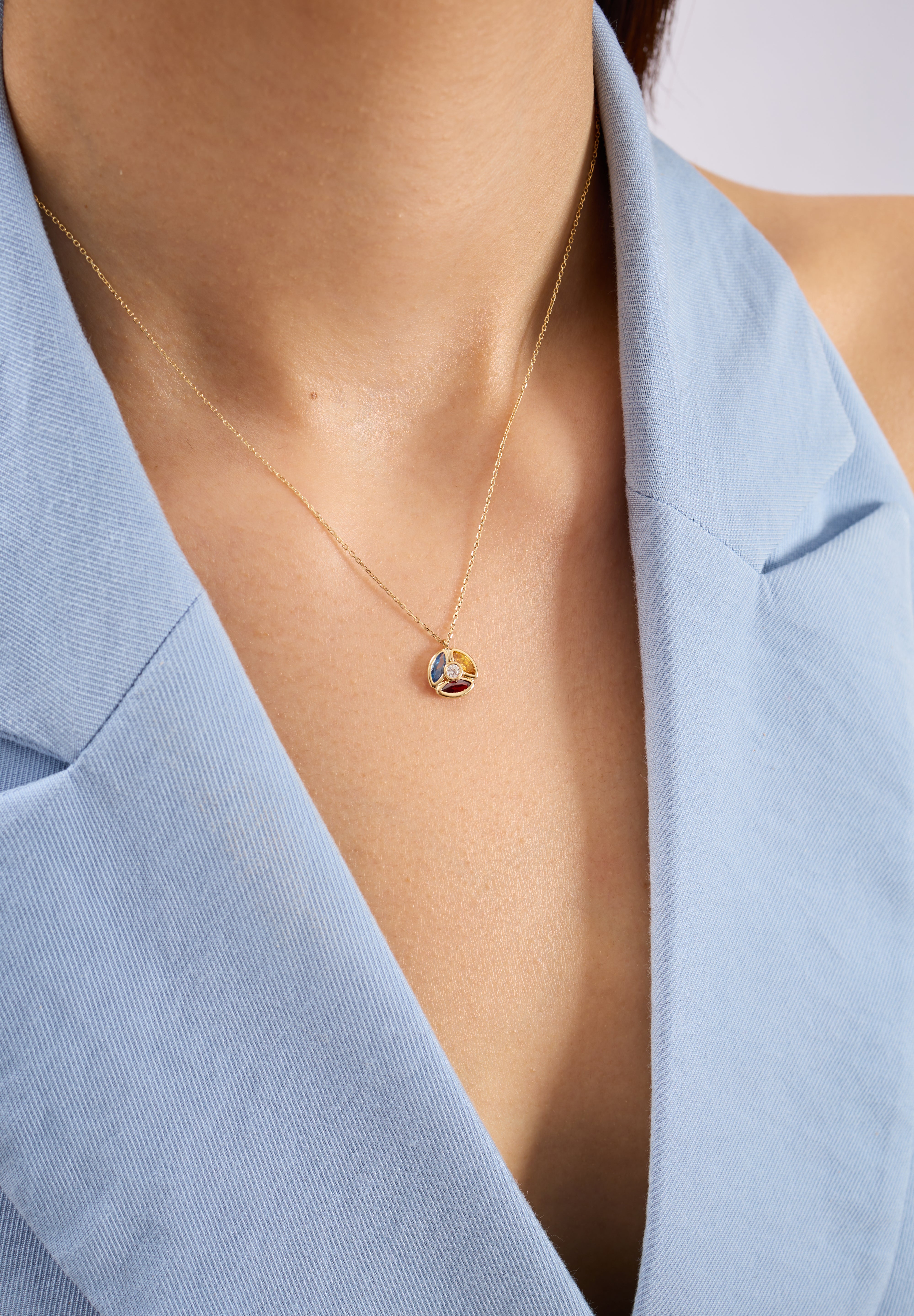 Pırlanta Taşlı Trilight 14 Ayar Altın Kadın Kolye; ışığın üç evresini – doğuş, parlama ve sükûnet – sembolize eden zarif bir tasarımdır. “Trilight”, günün en büyüleyici anı olan alacakaranlığın renginden ve geçişinden ilham alır; ışığın sönmeden önce bıraktığı o son ışıltı gibi, yaşamın içsel dengesiyle dışsal güzelliğini birleştirir.