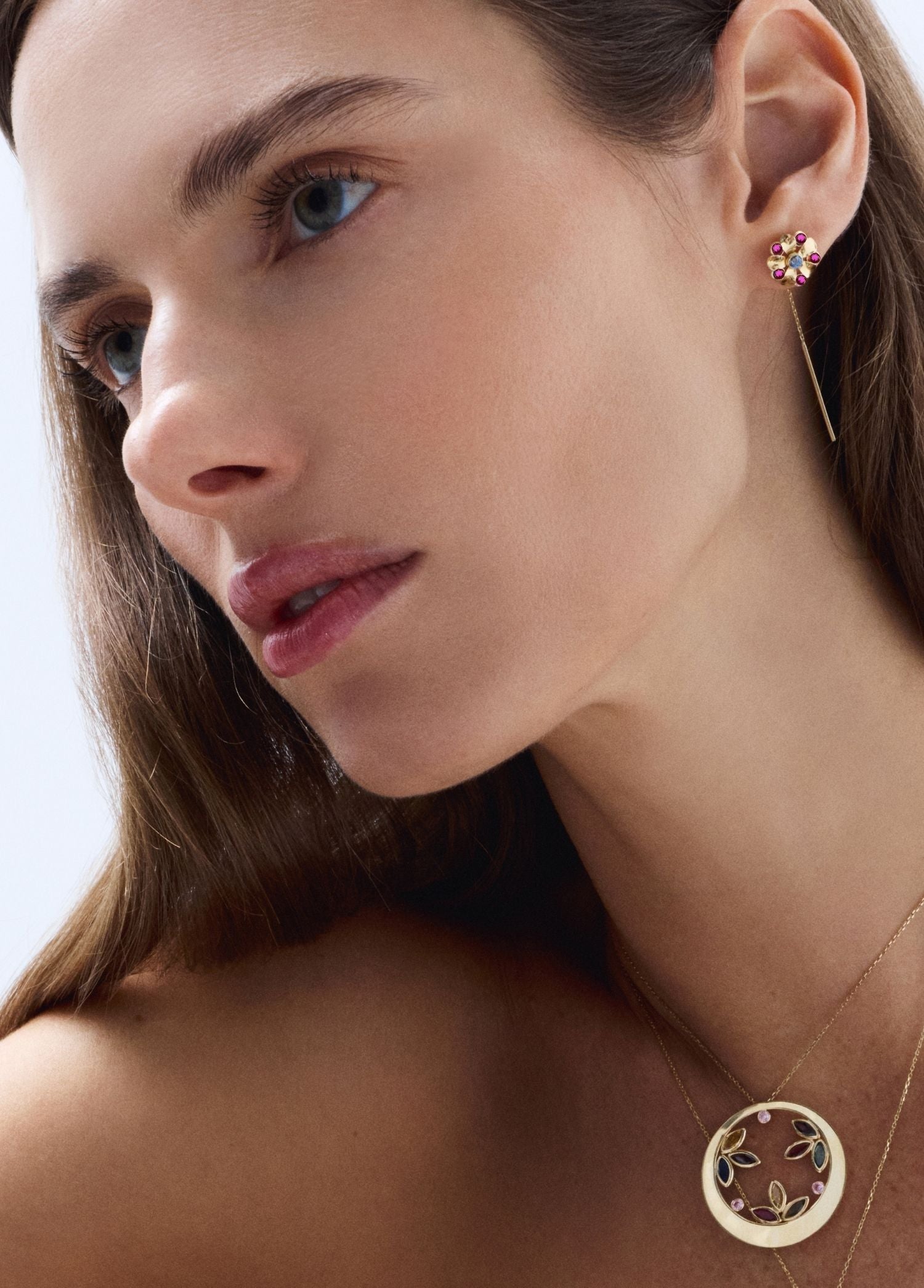14 ayar altının sıcak ışıltısı, yakut taşlarının parlak tonlarıyla birleşerek hem günlük stile zarif bir renk dokunuşu katar hem de özel anlarda romantik bir parıltı yaratır. Bu tasarım, doğanın saf zarafetini ve içsel gücün yumuşak ifadesini modern bir çizgide taşır.