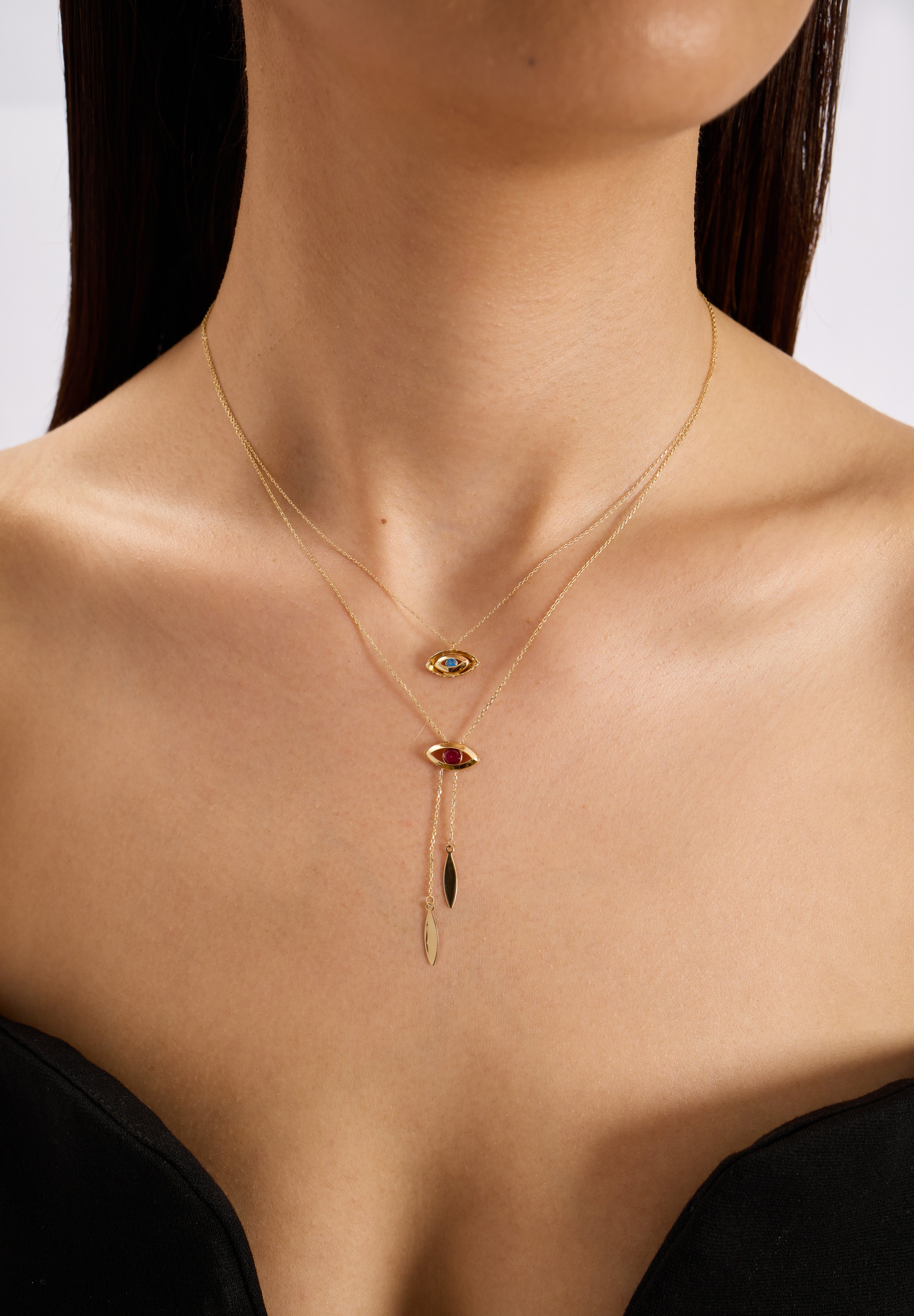 Sapphire Eye 14 Ayar Altın Kadın Kolye; bilgeliğin, sezginin ve koruyucu enerjinin simgesi olarak tasarlanmıştır. Göz formu, farkındalığı ve içsel rehberliği temsil ederken, safir taşının derin mavisi bu anlamı güçlendirerek huzuru ve ruhsal berraklığı yansıtır.